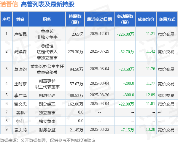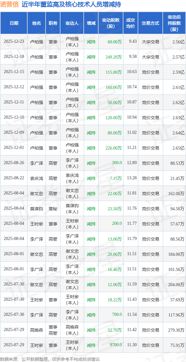 证券之星消息小盘股配资,根据12月24日市场公开信息、上市公司公告及交易所披露数据整理,诺普信(002215)最新董监高及相关人员股份变动情况:2025年12月23日公司董事卢柏强共减持公司股份60.0万股,占公司总股本为0.0597%。变动期间公司股价下跌1.53%,12月23日当日收盘报10.31元。 诺普信近半年内的董监高及核心技术人员增减持详情如下: ![]() 诺普信的高管列表及最新持股情况如下: ![]() 融资融券数据显示该股近5日融资净流入2478.37万,融资余额增加;融券净流出1.24万,融券余额减少。 该股最近90天内共有3家机构给出评级小盘股配资,买入评级3家。